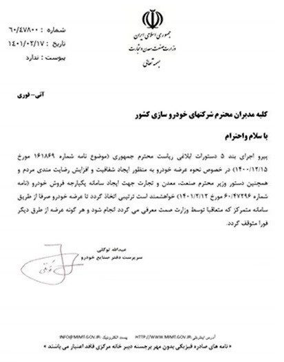 براساس ابلاغیه جدید وزارت صنعت به شرکتهای خودروساز فعلاً فروش خودرو توسط خودروسازان متوقف شده است.