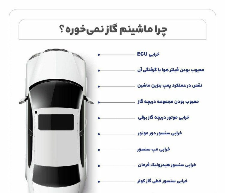 در عکس زیر سعی شده است خیلی راحت و مختصر به مهمترین دلایل گاز نخوردن موتور در خودرو اشاره کنیم.
