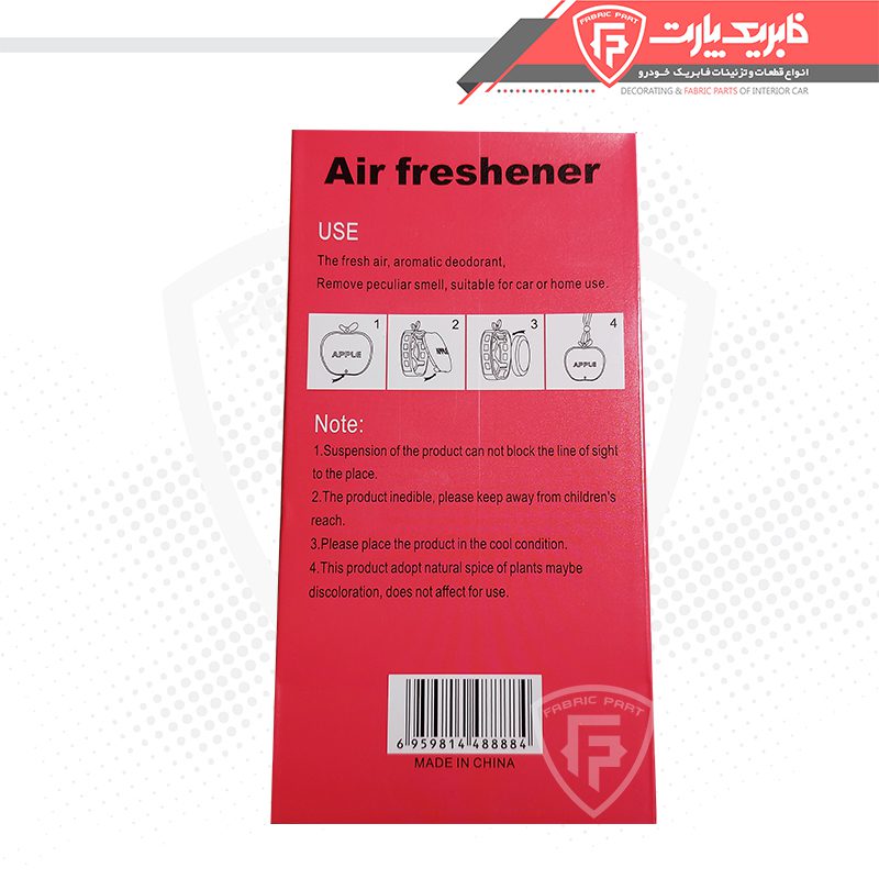 خوشبو کننده آویز طرح سیب APPLE ظاهری بسیار زیبا و شیک دارد که با آویزان کردن آن داخل نمایی بسیار زیبا ایجاد خواهد نمود. مواد بهکار رفته در این خوشبو کننده، ساخته شده از مواد گیاهی هستند و هیچ گونه ضرری برای سلامتی انسان ندارند. به دلیل شکل ظاهری و مواد بدنه این خشبو کننده، گرد و غبار بهراحتی روی این محصول نمینشیند. این خوشبو کننده دارای رایحههای مختلفی است.